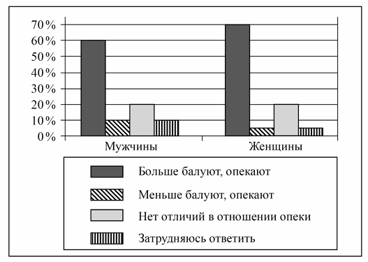 4) Одинаковые доли опрошенных мужчин считают, что меньше балуют, опекают и затрудняются ответить.