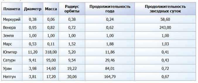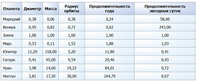 (Меркурий, Венера, Земля, Марс, Юпитер, Сатурн, Уран, Нептун, Диаметр, Масса, Радиус орбиты, Продолжительность звездных суток, Продолжительность года)