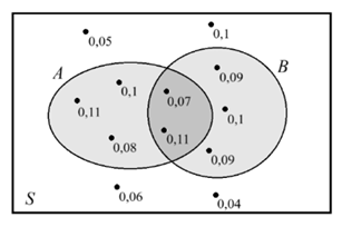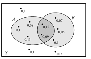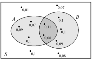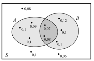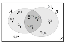 На диаграмме Эйлера изображён случайный опыт S, в котором 10 элементарных событий, показанных точками. Около каждого исхода подписана его вероятность. Найдите условную вероятность P(B|A). Результат округлите до сотых.