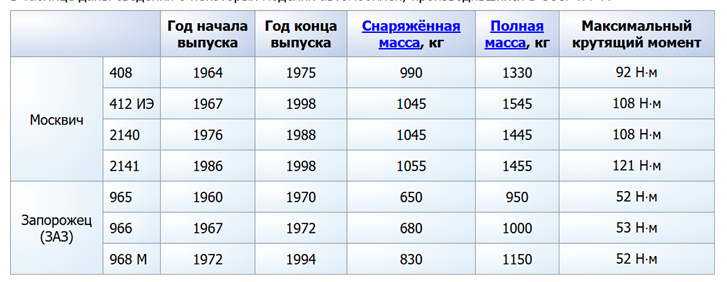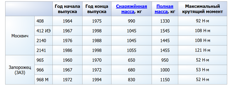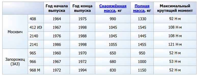 (Москвич 408, 412 ИЭ, 2140, 2141; Запорожец 965, 966, 968М. Год начала выпуска, Год конца выпуска, Снаряженная масса, Полная масса, Максимальный крутящий момент)