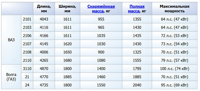 (ВАЗ 2101, 2103, 2106, 2107, 2108, 2110; Волга ГАЗ 21, 24, 3110. Длина, Ширина, Снаряженная масса, Полная масса, Максимальная мощность)