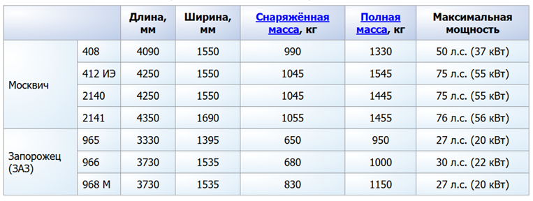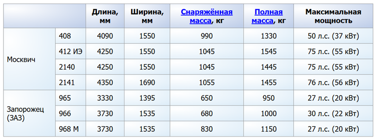 (Москвич 408, 412 ИЭ, 2140, 2141; Запорожец 965, 966, 968М. Длина, Ширина, Снаряженная масса, Полная масса, Максимальная мощность)