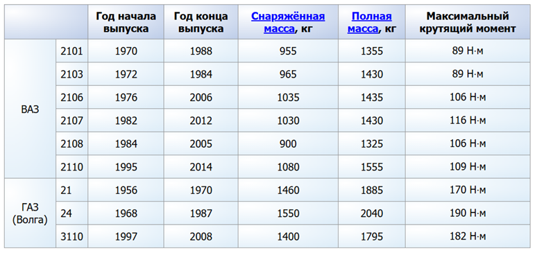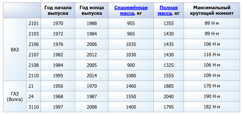 (ВАЗ 2101, 2103, 2106, 2107, 2108, 2110; ГАЗ Волга 21, 24, 3110. Год начала выпуска, Год конца выпуска, Снаряженная масса, Полная масса, Максимальный крутящий момент)