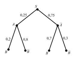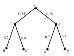 (Дано дерево: P(A)=0.25, P(not A)=0.75. P(B|A)=0.2, P(not B|A)=0.8. P(B|not A)=0.7, P(not B|not A)=0.3)