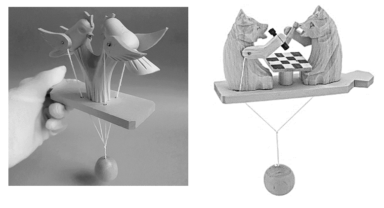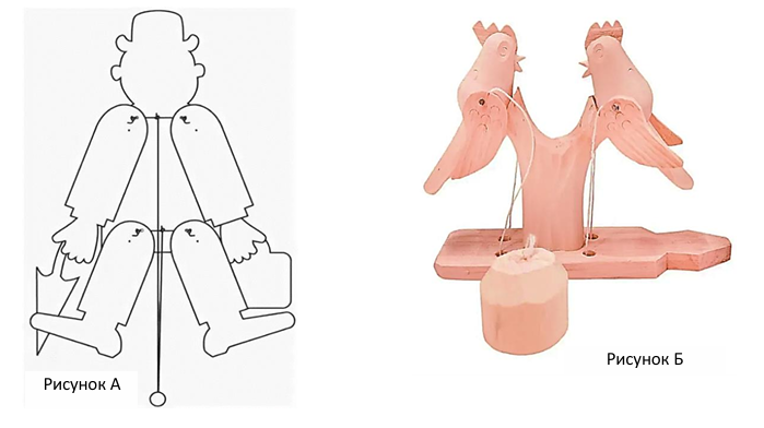 Элементы богородских игрушек приводят в движение простые, но хитроумные механизмы: планки, проволочки; деревянные шарики, подвешенные на нитках, которые при раскачивании натягивают то одну, то другую нитку... Например, если плавно покачивать или крутить деревянный грузик под игрушкой, курочки начнут клевать зерно (рисунок 3), зайцы — дёргать морковку, a мишки... печатать на компьютере. Богородцы всё время выдумывают что-то новое.