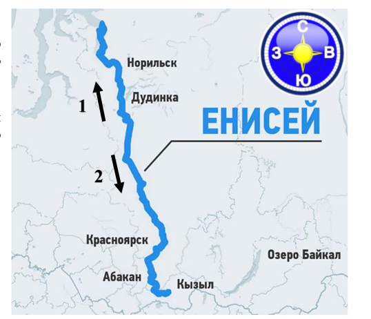 Рассмотри карту. Обведи номер стрелочки, которая правильно показывает, куда течёт Енисей.