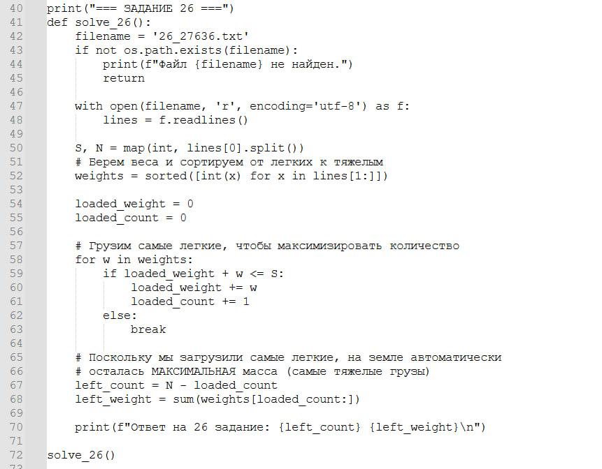 3. Обход ловушки составителей: В классическом 26 задании нас просят максимизировать массу *загруженных* грузов (тогда мы убираем последний легкий груз и пытаемся впихнуть вместо него максимально тяжелый). Но здесь просят максимизировать массу оставшихся.