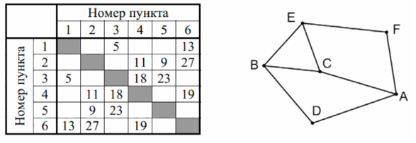 Так как таблицу и схему рисовали независимо друг от друга, нумерация населённых пунктов в таблице никак не связана с буквенными обозначениями на графе. Определите, какова сумма протяжённостей дорог из пункта В в пункт Е и из пункта А в пункт С.