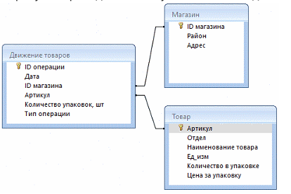 Таблица «Движение товаров» содержит записи о поставках товаров в магазины в течение первой половины августа 2021 г., а также информацию о проданных товарах. Поле Тип операции содержит значение Поступление или Продажа, а в соответствующее поле Количество упаковок, шт внесена информация о том, сколько упаковок товара поступило в магазин или было продано в течение дня. Заголовок таблицы имеет следующий вид.