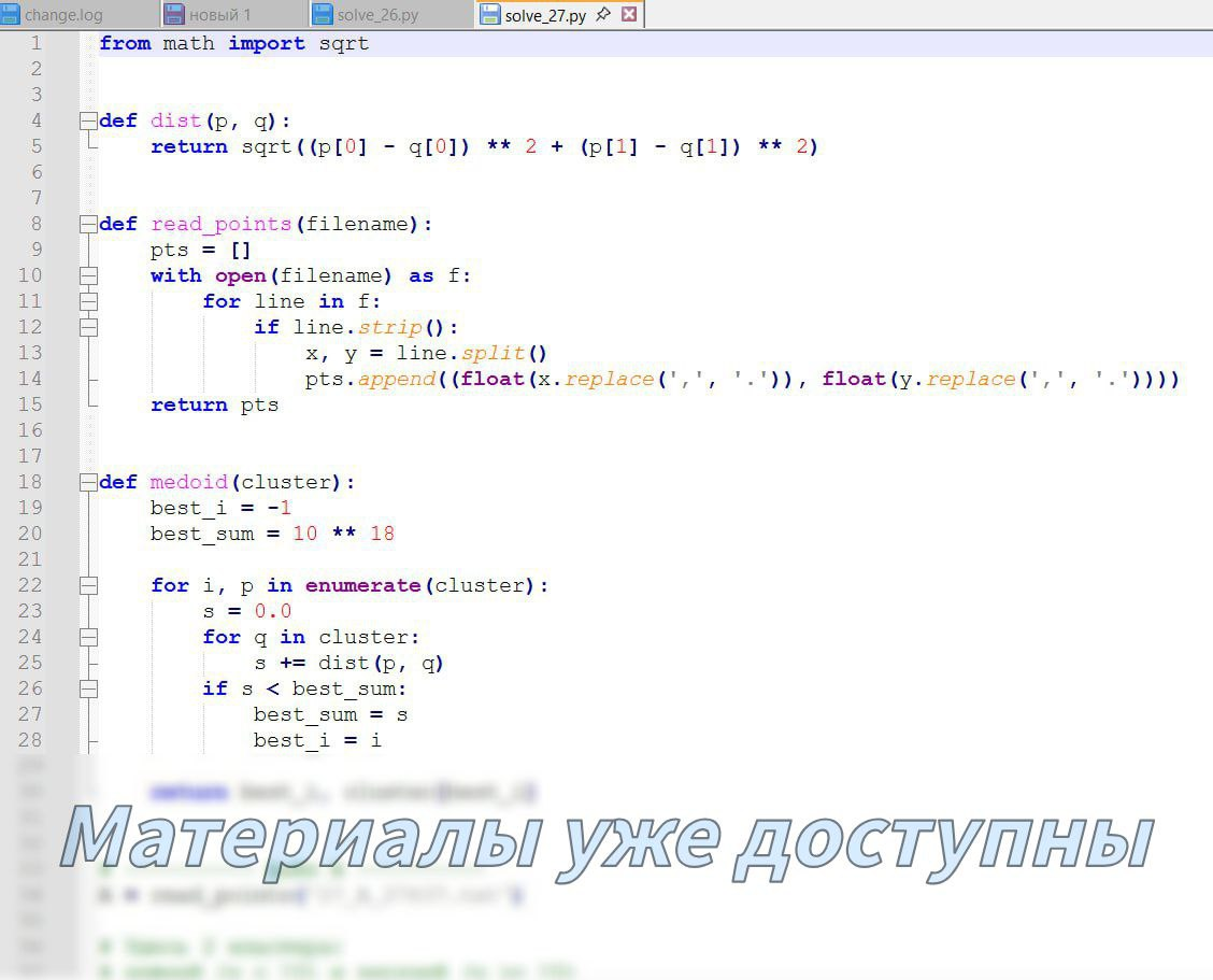 В чем подвох: Задание требует реализации алгоритма поиска центроида (медоида) кластера. Расстояние здесь вычисляется по классической евклидовой метрике. Дополнительная сложность для файла Б — найти кластер со «средним» количеством точек (медиану по размеру) и провести фильтрацию внутри него (исключить сам центр и посчитать точки в радиусе $R \le 1.6$).