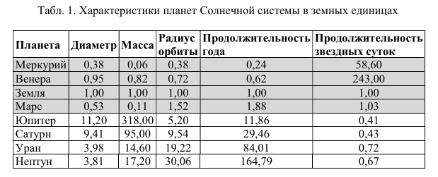 (Меркурий, Венера, Земля, Марс, Юпитер, Сатурн, Уран, Нептун, Диаметр, Масса, Радиус орбиты, Продолжительность года, Продолжительность звездных суток)