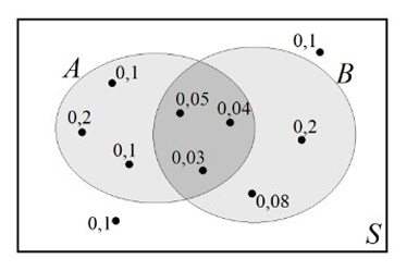 В множестве B (по графику из работы) содержатся точки с вероятностями. Суммарная вероятность множества B (P(B)) рассчитывается сложением вероятностей всех исходов внутри B.