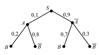 Из данных дерева графа: вероятность пойти по ветке A равна 0,1. Вероятность пойти по ветке не-A (A̅) равна 0,9.