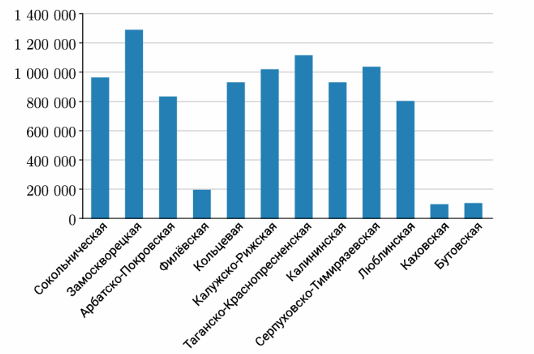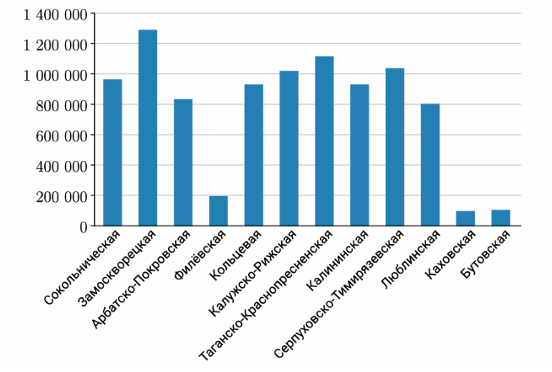 По результатам исследования пассажиропотока Московского метрополитена была составлена следующая диаграмма. По горизонтали отображается название линий метрополитена, по вертикали количество пассажиров в сутки. Оцените по диаграмме, какая из веток имеет пассажиропоток 1 114 000 пассажиров в сутки.