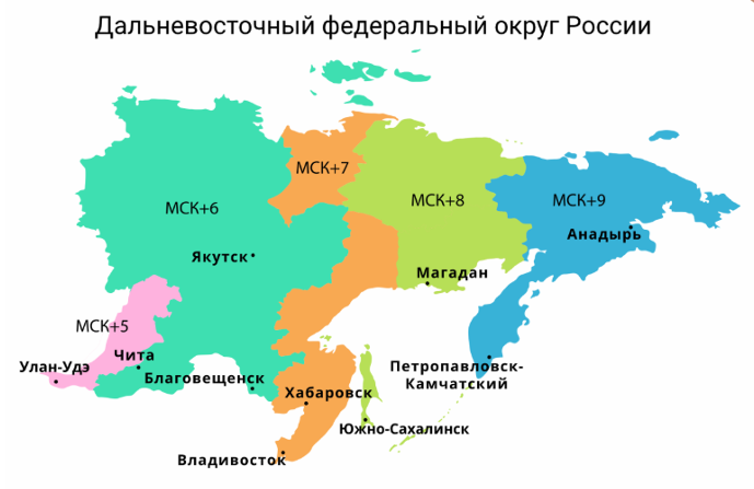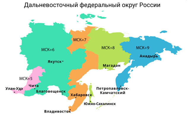 В самом большом федеральном округе России Дальневосточном целых 5 часовых поясов. Игорь летит вечерним рейсом на самолёте из Владивостока в Москву. В какой-то момент пилот объявил, что до посадки осталось ровно 3 часа. Тогда Игорь посмотрел на свои часы, которые ещё не успел перевести на московское время. Во сколько по московскому времени пилот планирует совершить посадку? Воспользуйтесь картой часовых поясов Дальневосточного федерального округа России.