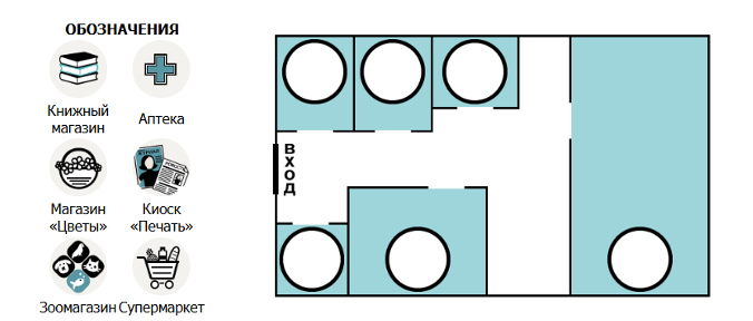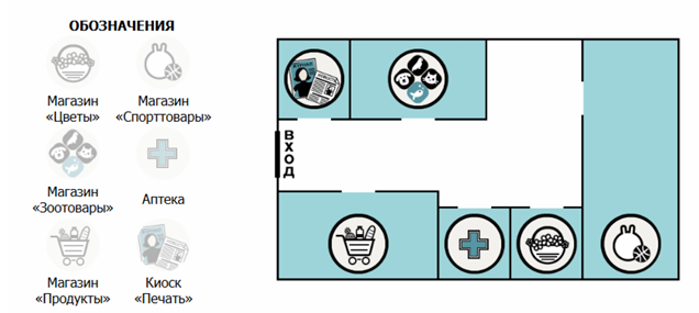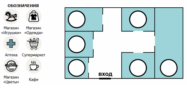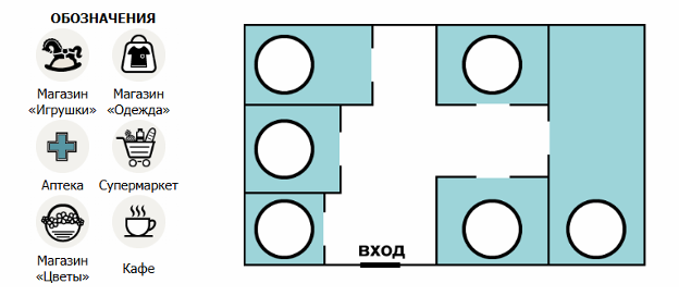 Обозначения: Магазин «Игрушки», Магазин «Одежда», Аптека, Супермаркет, Магазин «Цветы», Кафе.
