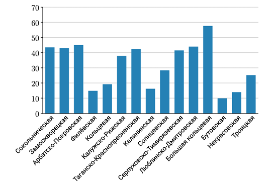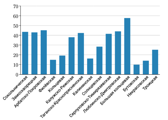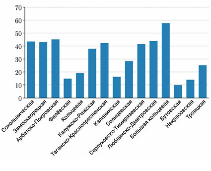 На сайте Московского метрополитена опубликовали диаграмму, показывающую протяжённость линий метро. По горизонтали отображается название линий метрополитена, по вертикали в километрах. Оцените по диаграмме, какая линия имеет длину 9,98 км.
