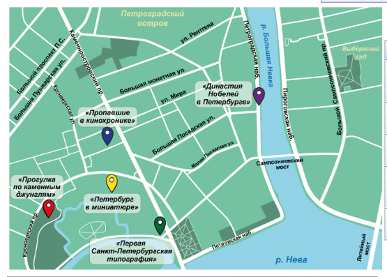 Тайники: «Первая Санкт-Петербургская типография», «Петербург в миниатюре», «Прогулка по каменным джунглям», «Династия Нобелей в Петербурге», «Пропавшие в кинохронике».