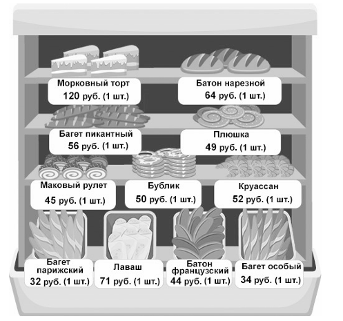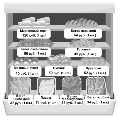 Рассмотри рисунок витрины магазина. Ваня дал кассиру 500 рублей, чтобы расплатиться за два багета особых. Сколько рублей сдачи он должен получить?