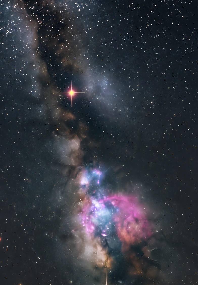 1. На фотографии запечатлён участок неба с яркой звездой и рассеянным скоплением. Определите, какие из перечисленных объектов могут находиться в этом районе:
