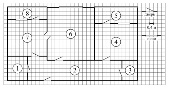 В жилом комплексе «Озёрки» новосёлам предоставляются квартиры улучшенной планировки. На рисунке изображён план такой двухкомнатной квартиры. Сторона одной клетки на плане соответствует 0,4 м, а условные обозначения двери и окна приведены в правой части рисунка.