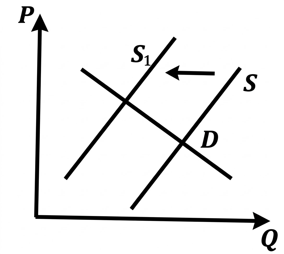 На графике изображено изменение ситуации на рынке местной рыбы и морепродуктов в стране Z. Кривая предложения переместилась из положения S в положение S1 при неизменном спросе D. (На графике P — цена товара, Q — количество товара).