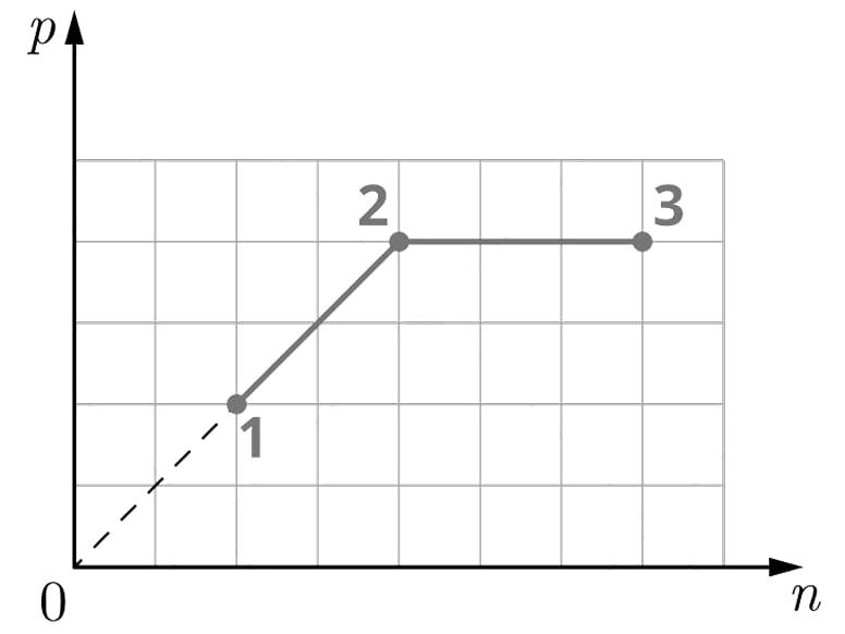 Постоянное количество одноатомного идеального газа участвует в процессе, график которого изображён на рисунке в координатах p-n, где p — давление газа, n — его концентрация. Определите, получает газ теплоту или отдаёт в процессах 1-2 и 2-3. Ответ поясните, опираясь на законы молекулярной физики и термодинамики.