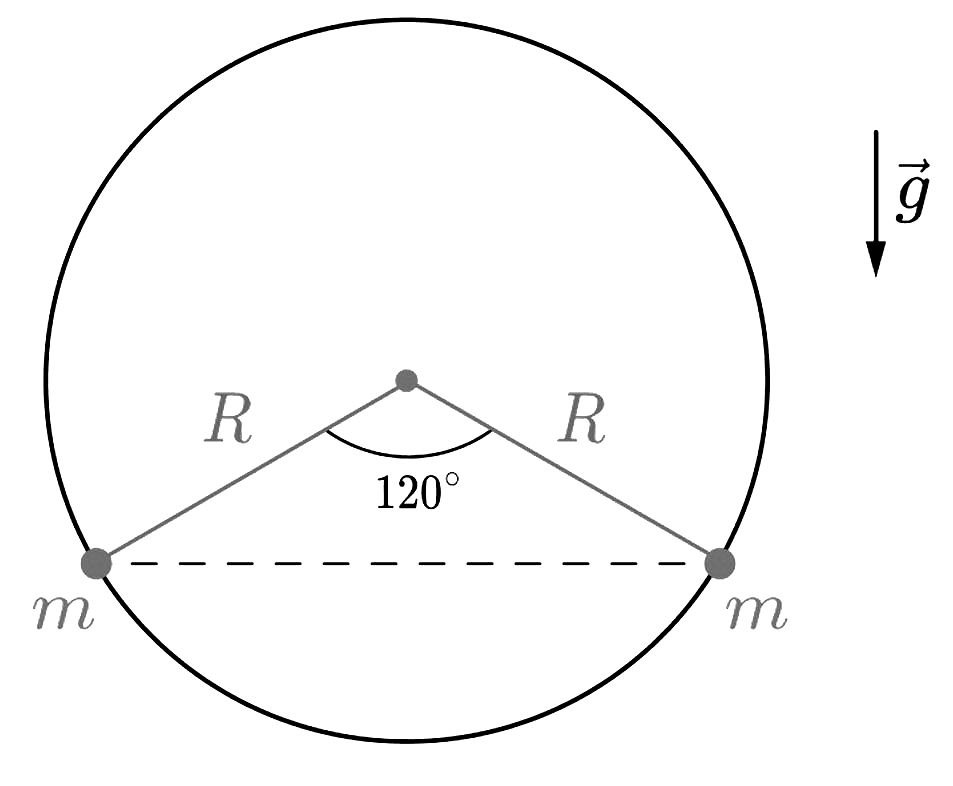По кольцу радиусом R, расположенному в вертикальной плоскости в поле силы тяжести Земли, могут скользить без трения одинаковые шарики массой m с одинаковыми зарядами. Какие заряды имеют шарики, если они расположились на концах горизонтальной хорды, проходящей ниже центра кольца и стягивающей дугу 120°? Сделайте рисунок с указанием сил, действующих на шарики.