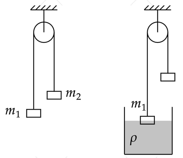 Два тела подвешены за нерастяжимую и невесомую нить к идеальному блоку, как показано на рисунке. При этом первое тело массой m1 = 450 г движется из состояния покоя вниз с ускорением a = 2 м/с2. Если первое тело опустить в воду с плотностью ρ = 1000 кг/м3, находящуюся в большом объёме, система будет находиться в равновесии. Сделайте рисунки с указанием сил. Определите объём погружённой в воду части тела V. Какие законы Вы используете для решения задачи? Обоснуйте их применение.