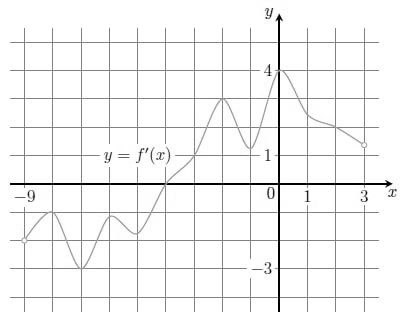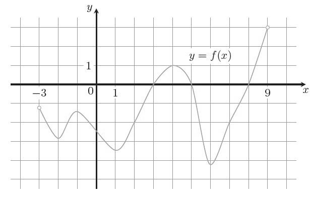 На рисунке изображен график функции y=f(x) определенной на интервале (-3; 9). Найдите количество точек, в которых производная функции f(x) равна 0.