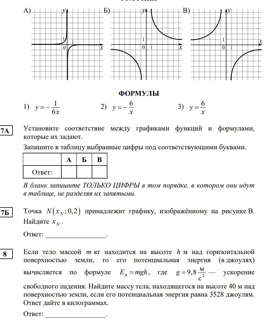 Задания 7А и 7Б для всех вариантов: необходимо установить соответствие между графиками (A, Б, В) и формулами, а также найти абсциссу точки на графике по заданной ординате.