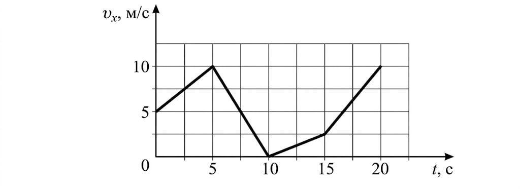 На рисунке приведён график зависимости проекции скорости vx от времени для тела, движущегося прямолинейно вдоль оси Ох. Определите проекцию ax ускорения тела в интервале времени от 5 до 10 с. Ответ запишите с учётом знака проекции.