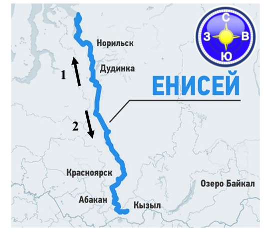 Рассмотри карту. Обведи номер стрелочки, которая правильно показывает, куда течёт Енисей.