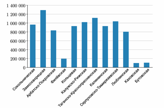 По результатам исследования пассажиропотока Московского метрополитена была составлена следующая диаграмма. По горизонтали отображается название линий метрополитена, по вертикали количество пассажиров в сутки. Оцените по диаграмме, какая из веток имеет пассажиропоток 1 114 000 пассажиров в сутки.