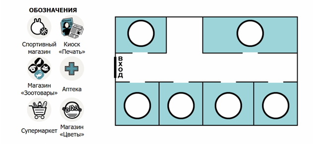 Обозначения: Магазин «Игрушки», Магазин «Одежда», Аптека, Супермаркет, Магазин «Цветы», Кафе.