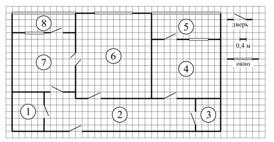 В жилом комплексе «Озёрки» новосёлам предоставляются квартиры улучшенной планировки. На рисунке изображён план такой двухкомнатной квартиры. Сторона одной клетки на плане соответствует 0,4 м, а условные обозначения двери и окна приведены в правой части рисунка. Именно с этого практико-ориентированного задания начинается диагностическая работа, которую пишут школьники 27 региона. В этой статье мы подробно разберем решения и ответы к пробному тестированию.